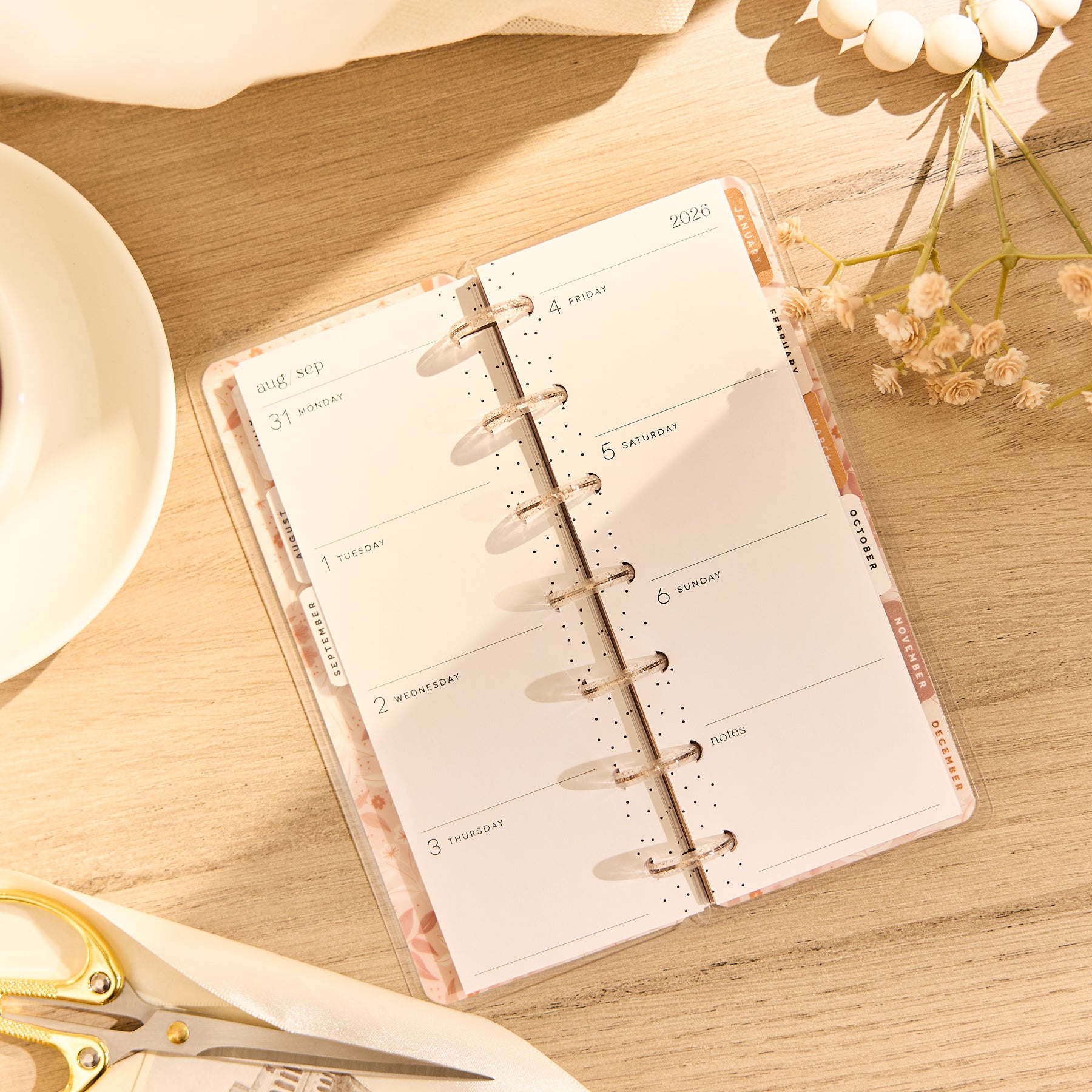 Bring a little warmth and serenity to your everyday planning with the Dune Hues Skinny Mini Spiral Planner. This 12-month dated planner (July 2026–June 2027) features a soft, sun-washed palette of blush tones, gentle patterns, and delicate foil accents that capture the calming beauty of drifting desert hues. Compact and elegant, it’s designed to bring a peaceful touch to even your busiest days.