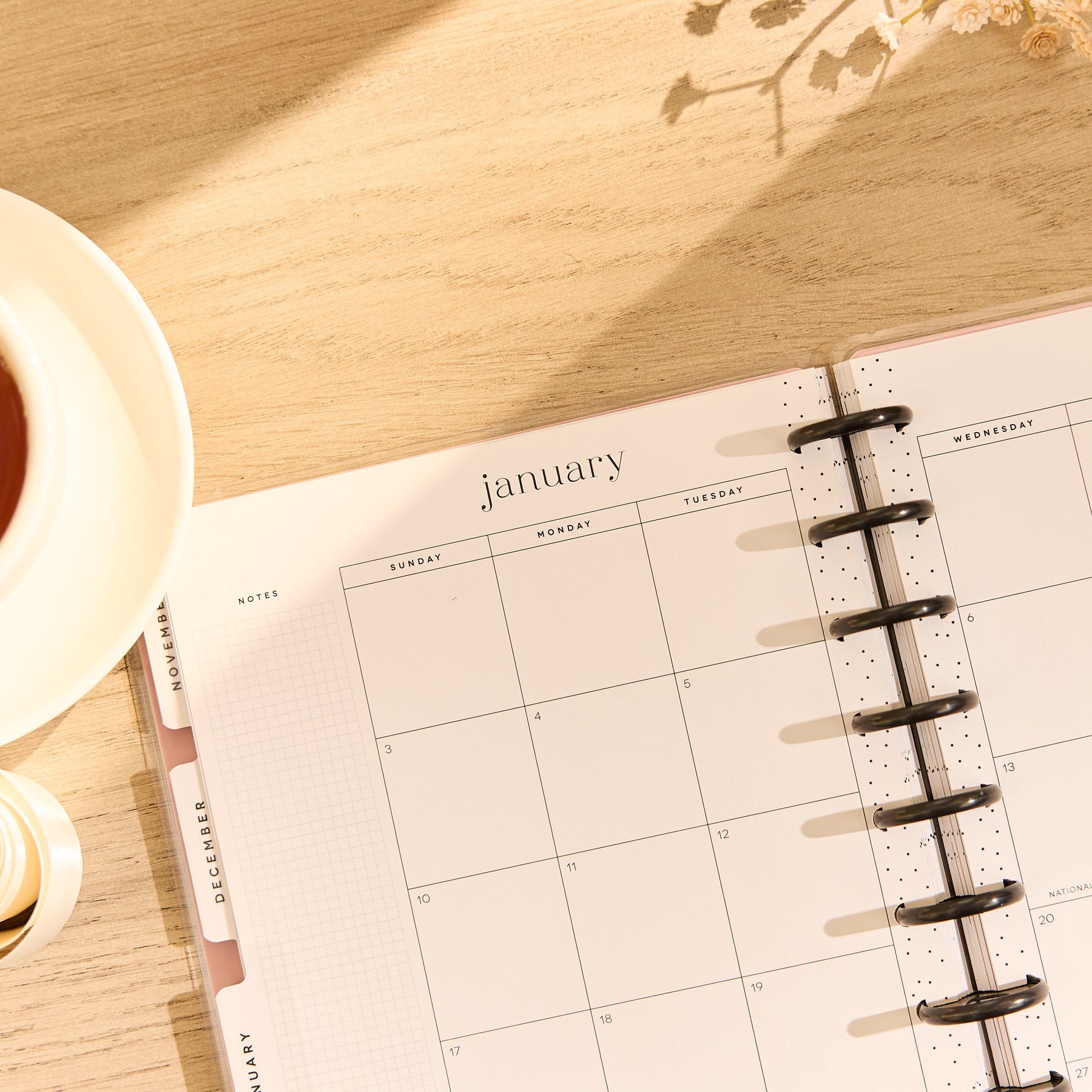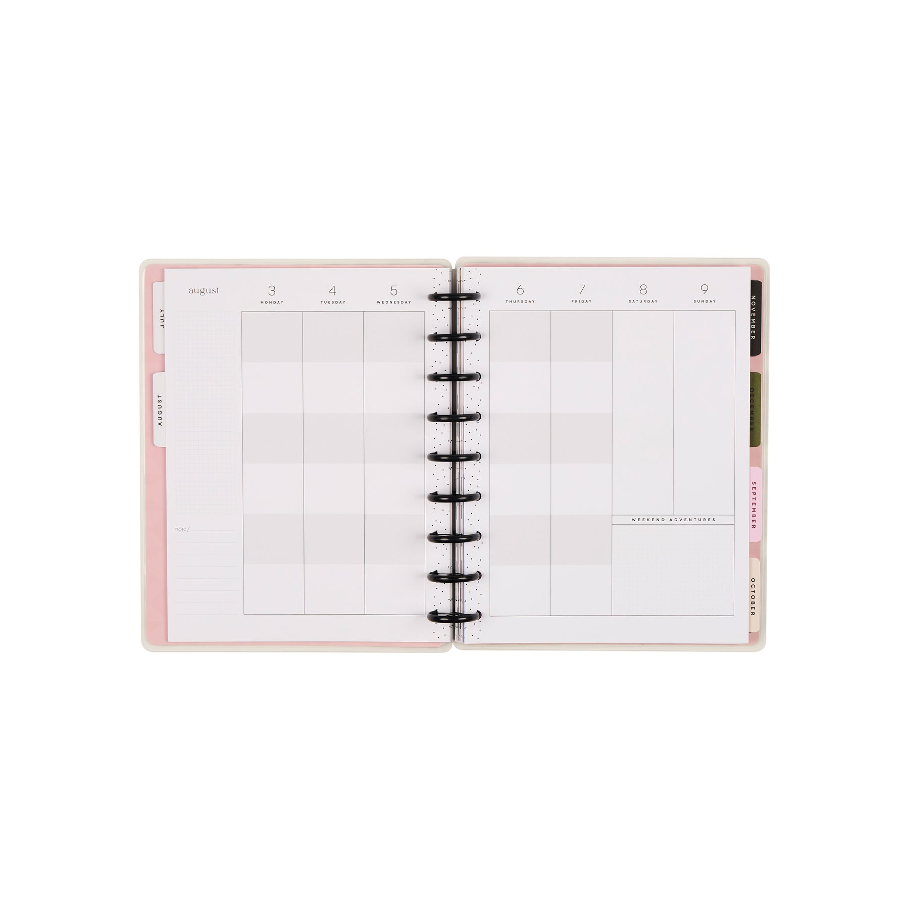 • Monthly calendars + weekly spreads