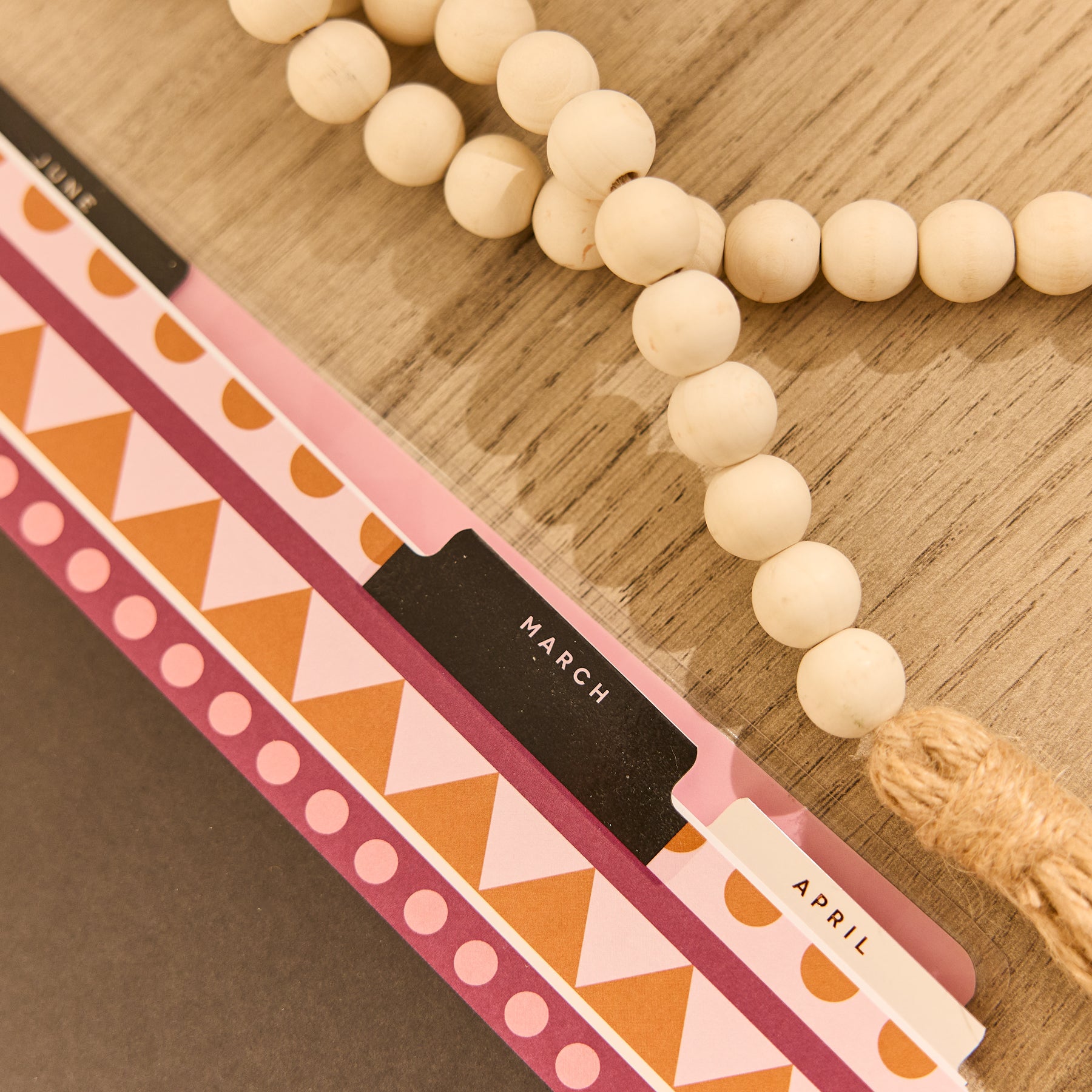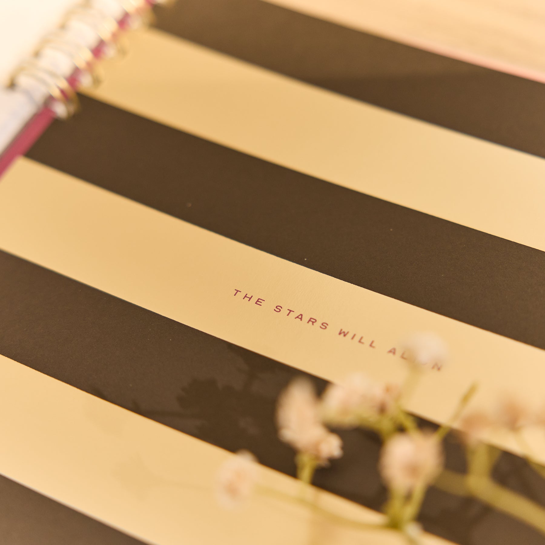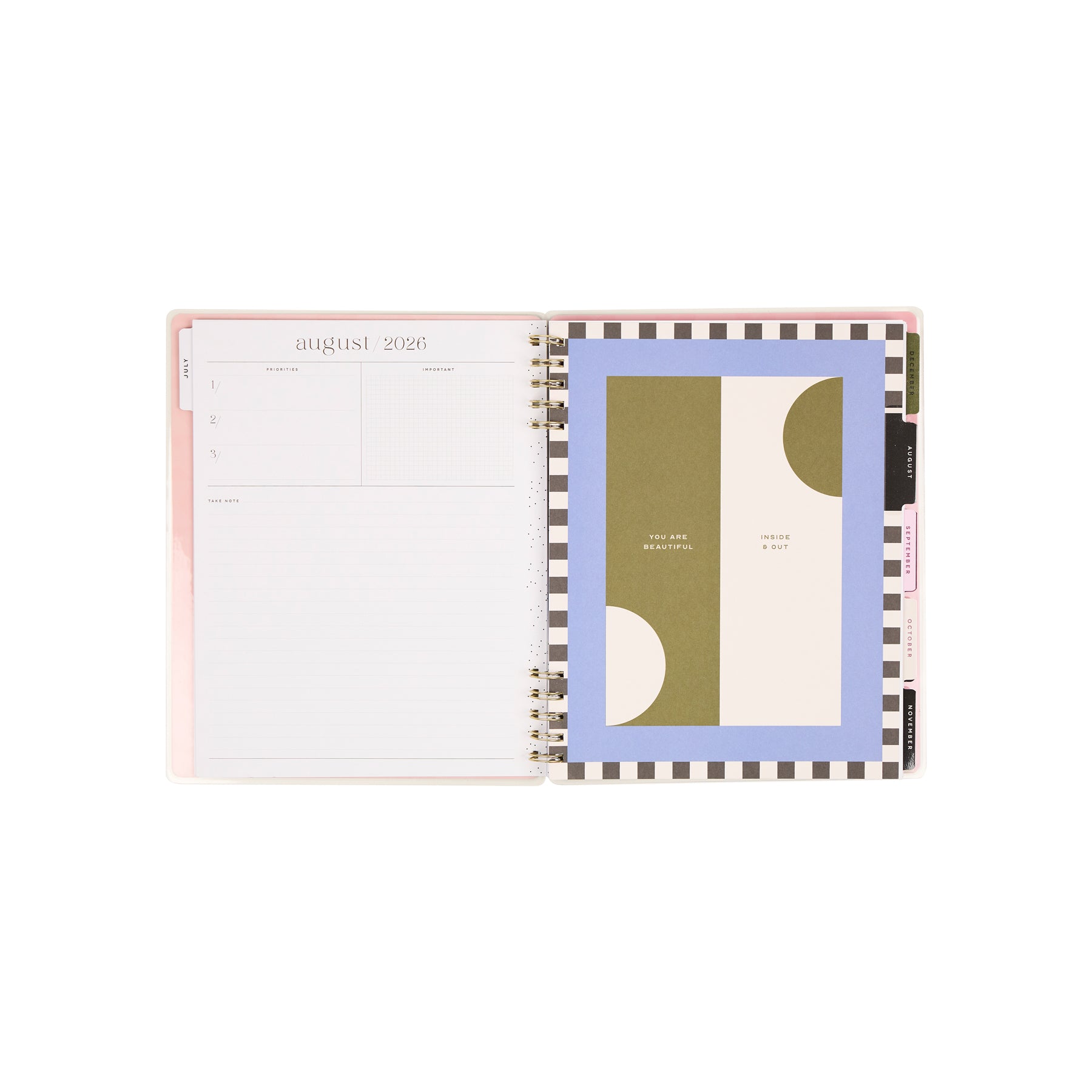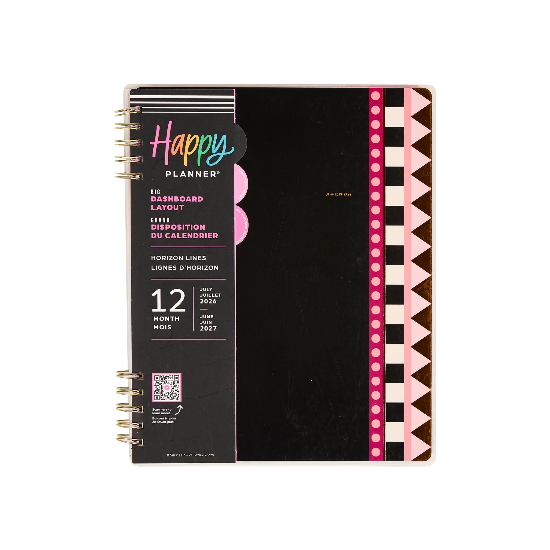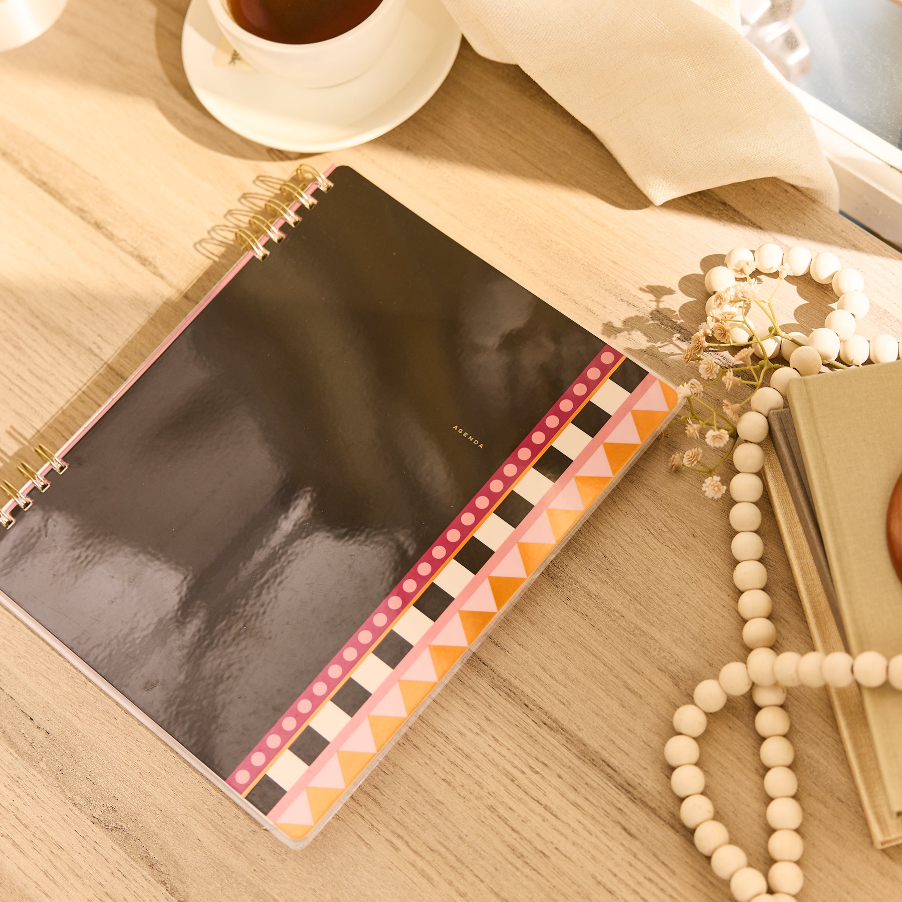 Bring bold structure and modern style to your planning with the Horizon Lines Big Spiral Planner. This 12-month dated planner (July 2026-June 2027) features a sleek black cover accented with geometric patterns in warm copper, blush, and sand tones. Specialty foil detailing adds a refined shimmer, creating a clean yet elevated look for your everyday planning.