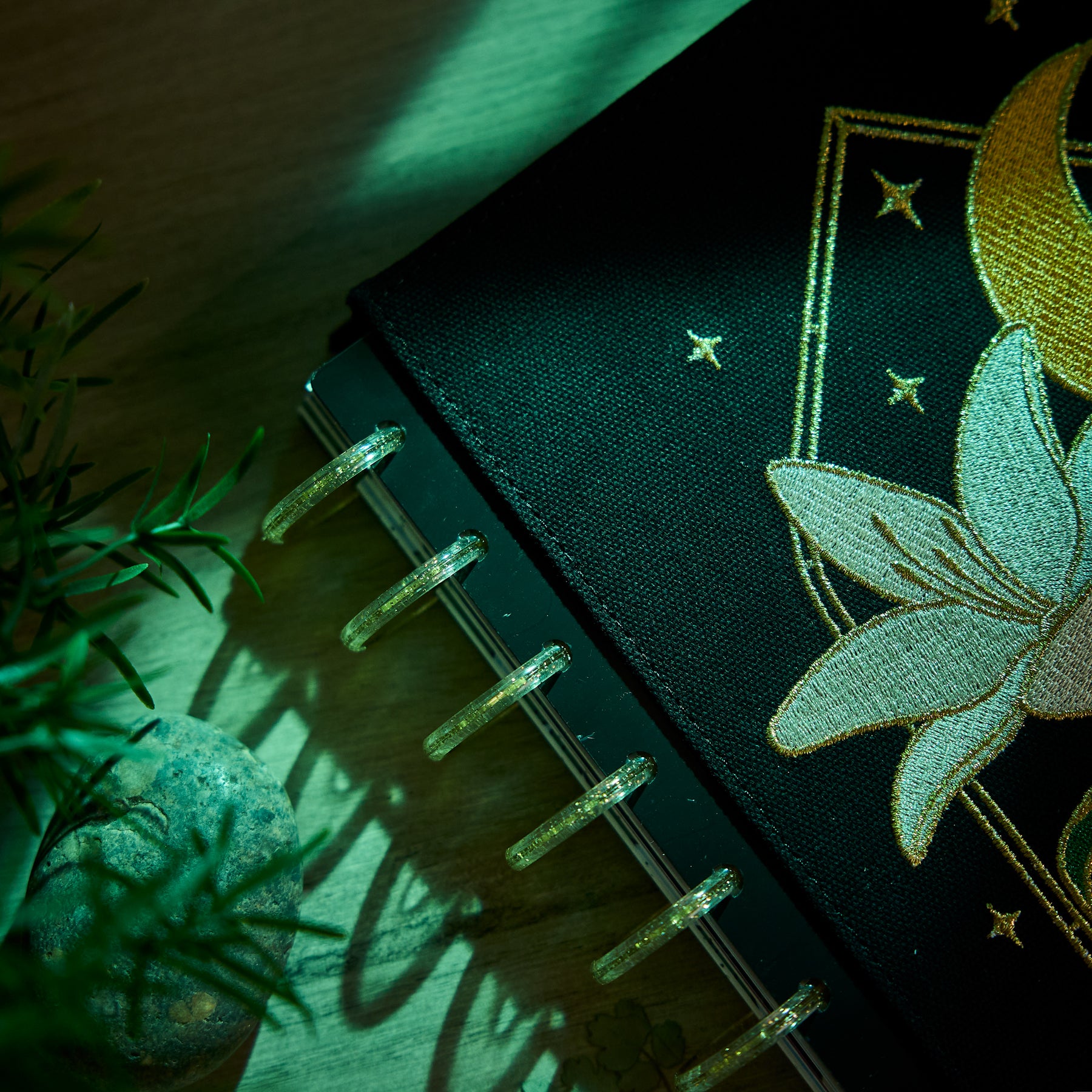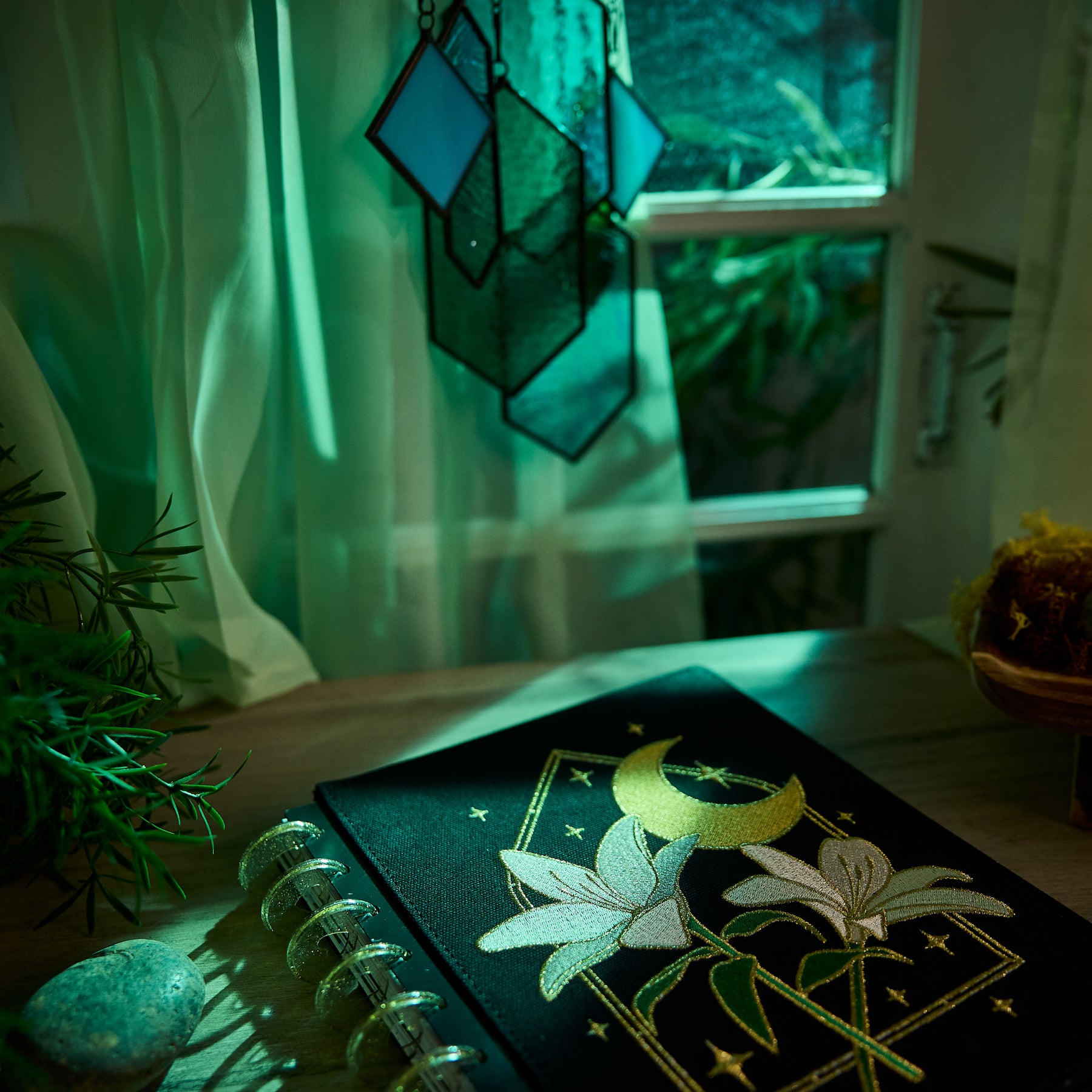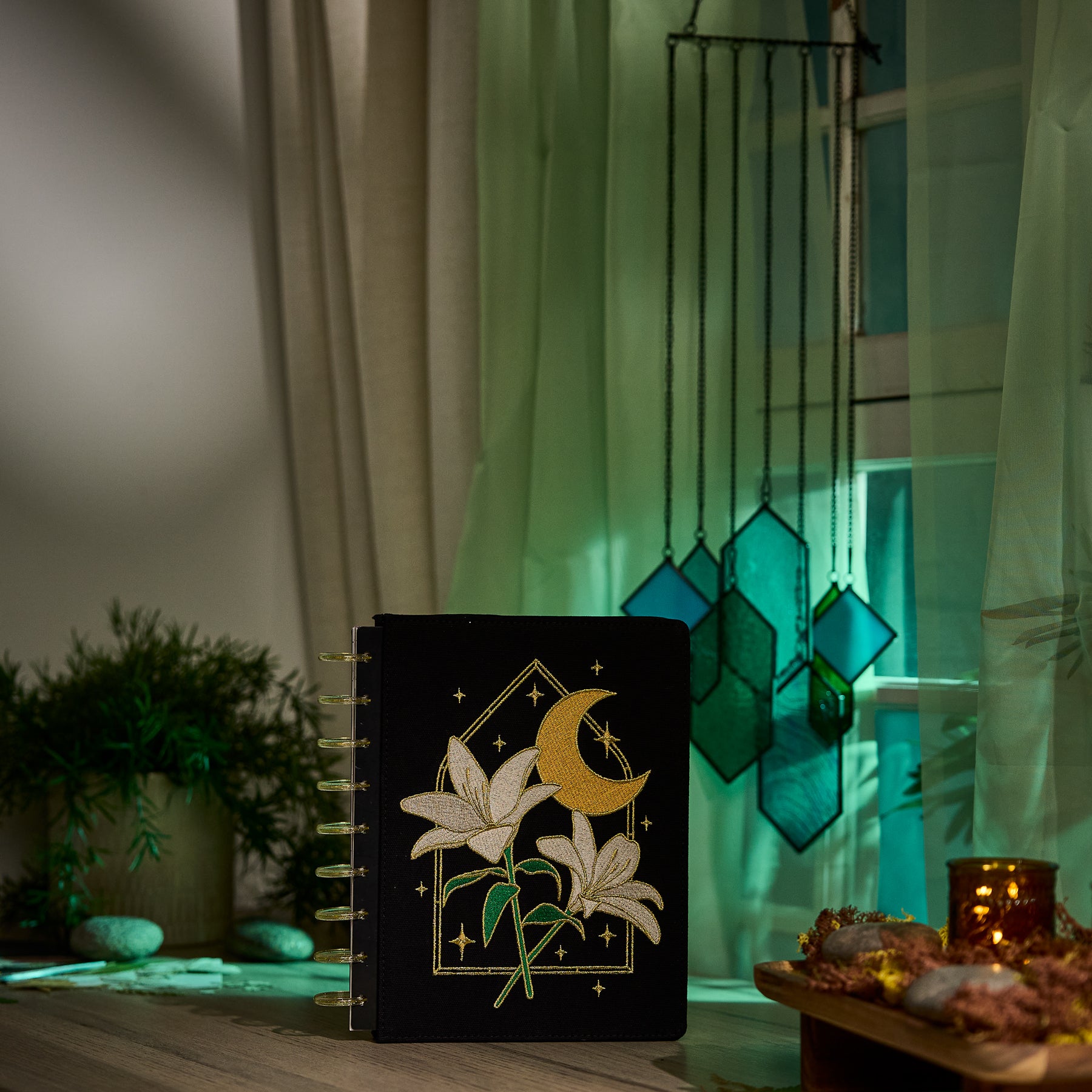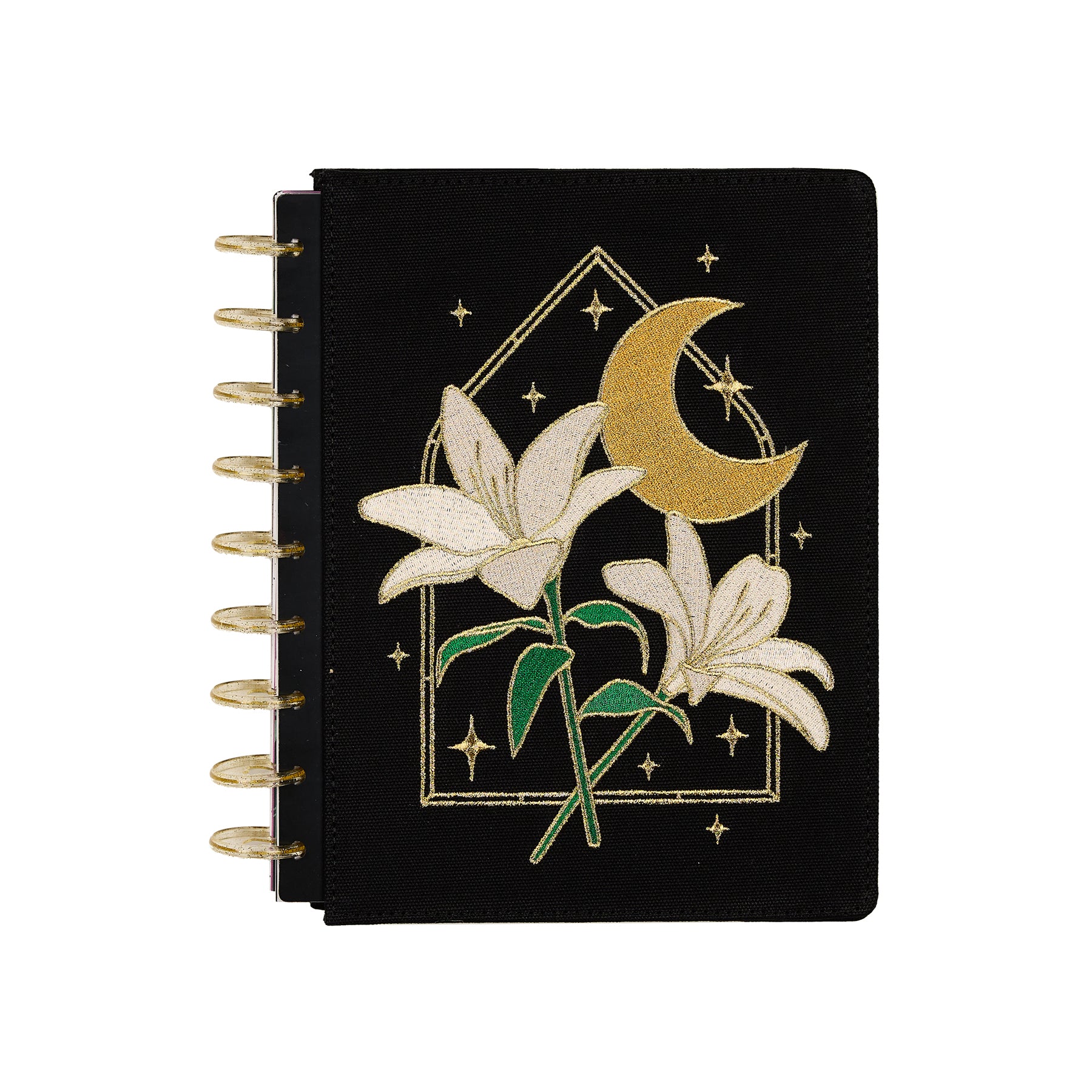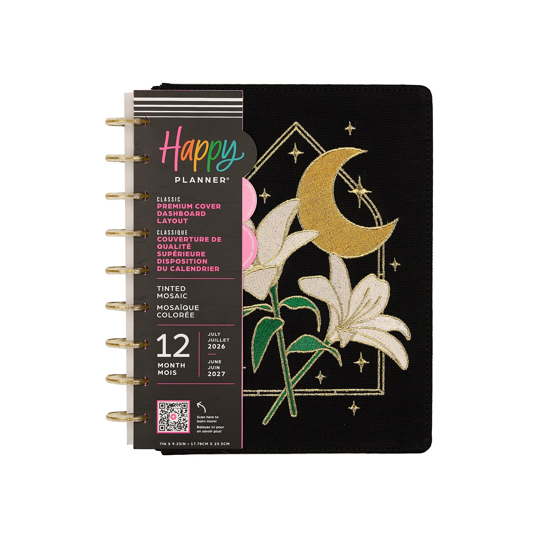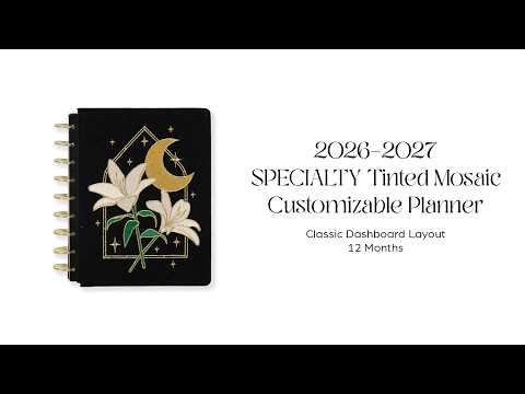 Bring celestial charm and artistic detail to your planning routine with the 2026–2027 SPECIALTY Tinted Mosaic Classic Dashboard Planner. This magical design features an embroidered cover with metallic gold details, blooming florals, and a dreamy moonlit motif  - perfect for inspiring intention, reflection, and creativity every day.