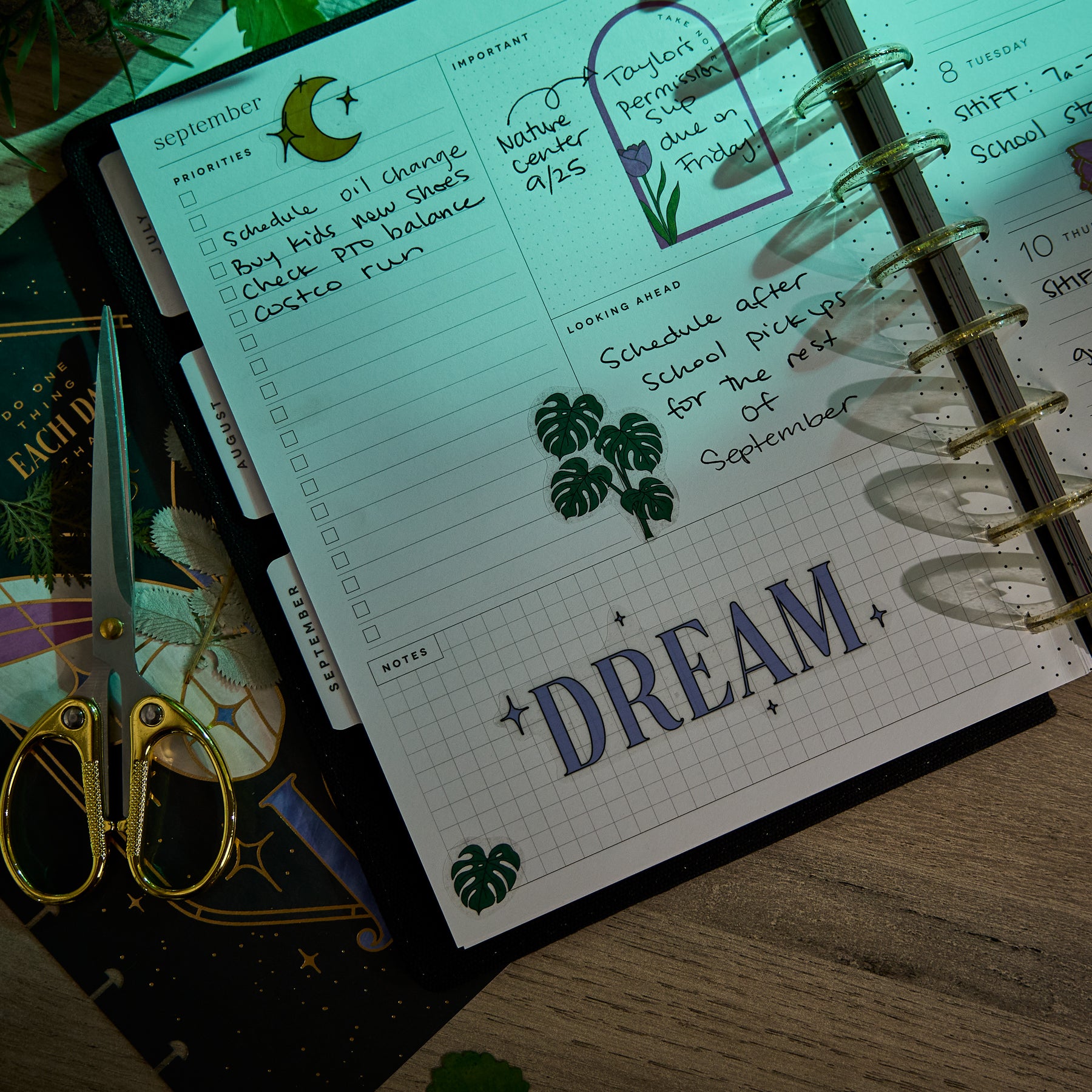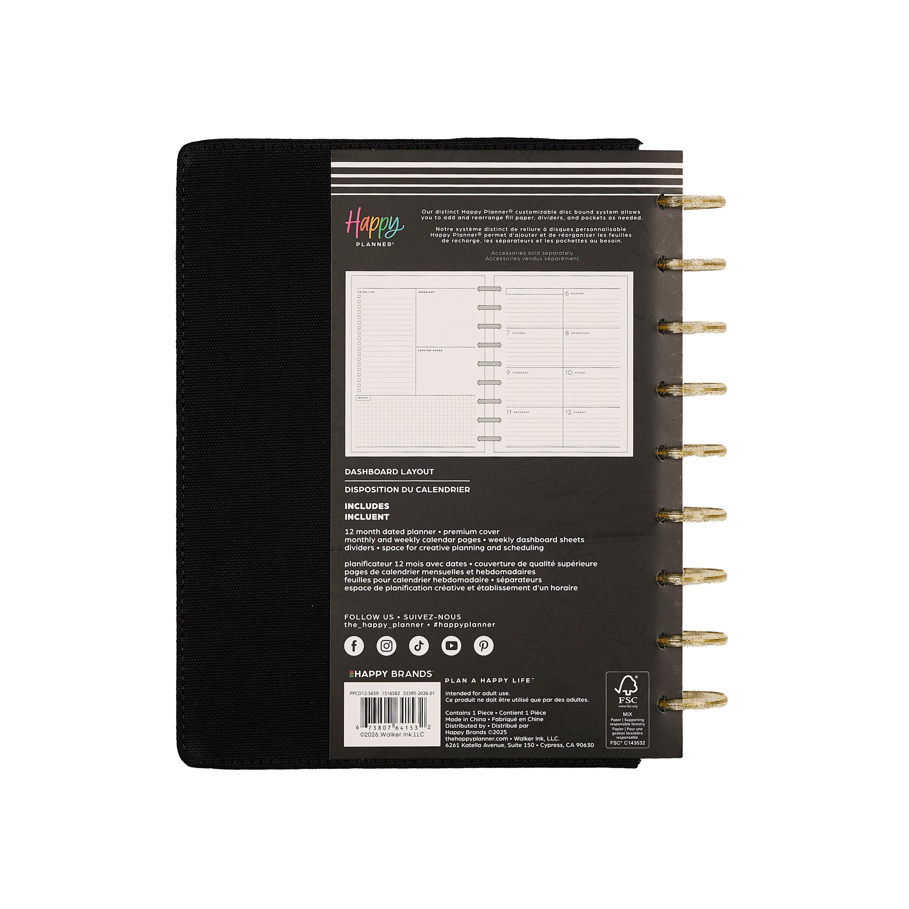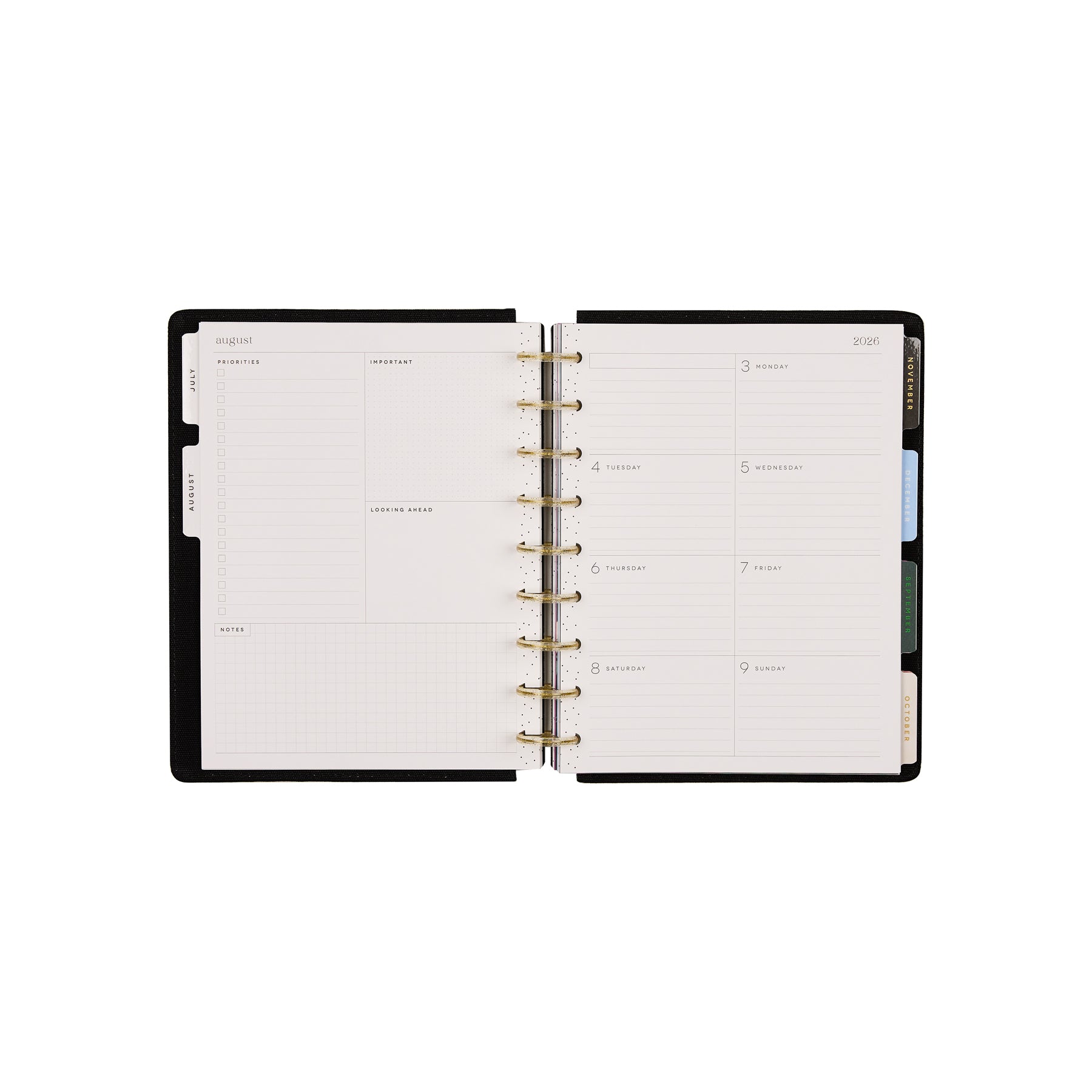 • Dashboard layout – weekly pages designed for lists, priorities & reminders